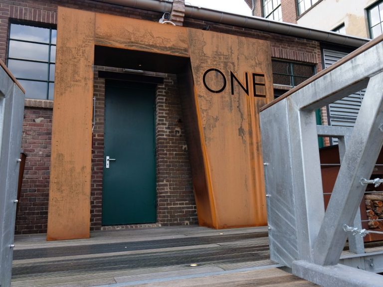 Voor Restaurant One realiseerden we een entreeportaal dat meteen sfeer zet. Een constructie van cortenstaal, vijf bij drie meter, volledig op maat ontwikkeld en laser-gesneden. Ruw materiaal met een warme uitstraling, precies zoals het concept vroeg.